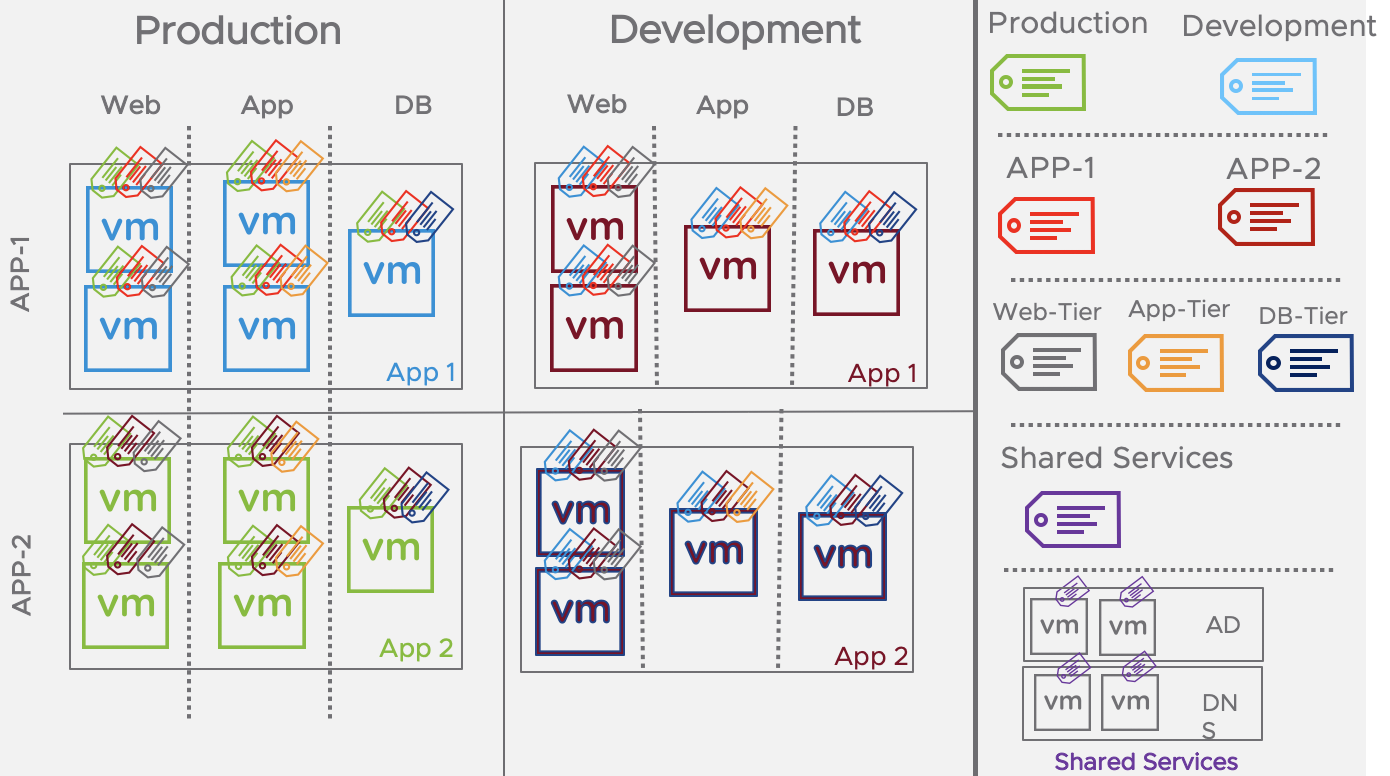 Par exemple, si un tenant possÚde 3 000 applications à trois niveaux dans trois environnements (Dev, Test et Prod). Si ce tenant adopte uniquement une approche de tagging combiné (en définissant un tag pour chaque combinaison), il aura 3 000 (applications) x 3 (environnements) x 3 (niveaux) = 27 000 tags nécessitant 27 000 rÚgles ou plus. En revanche, s'ils utilisent trois tags (une pour l'environnement, une pour l'application et une pour le niveau), ils obtiendront 3 006 tags.