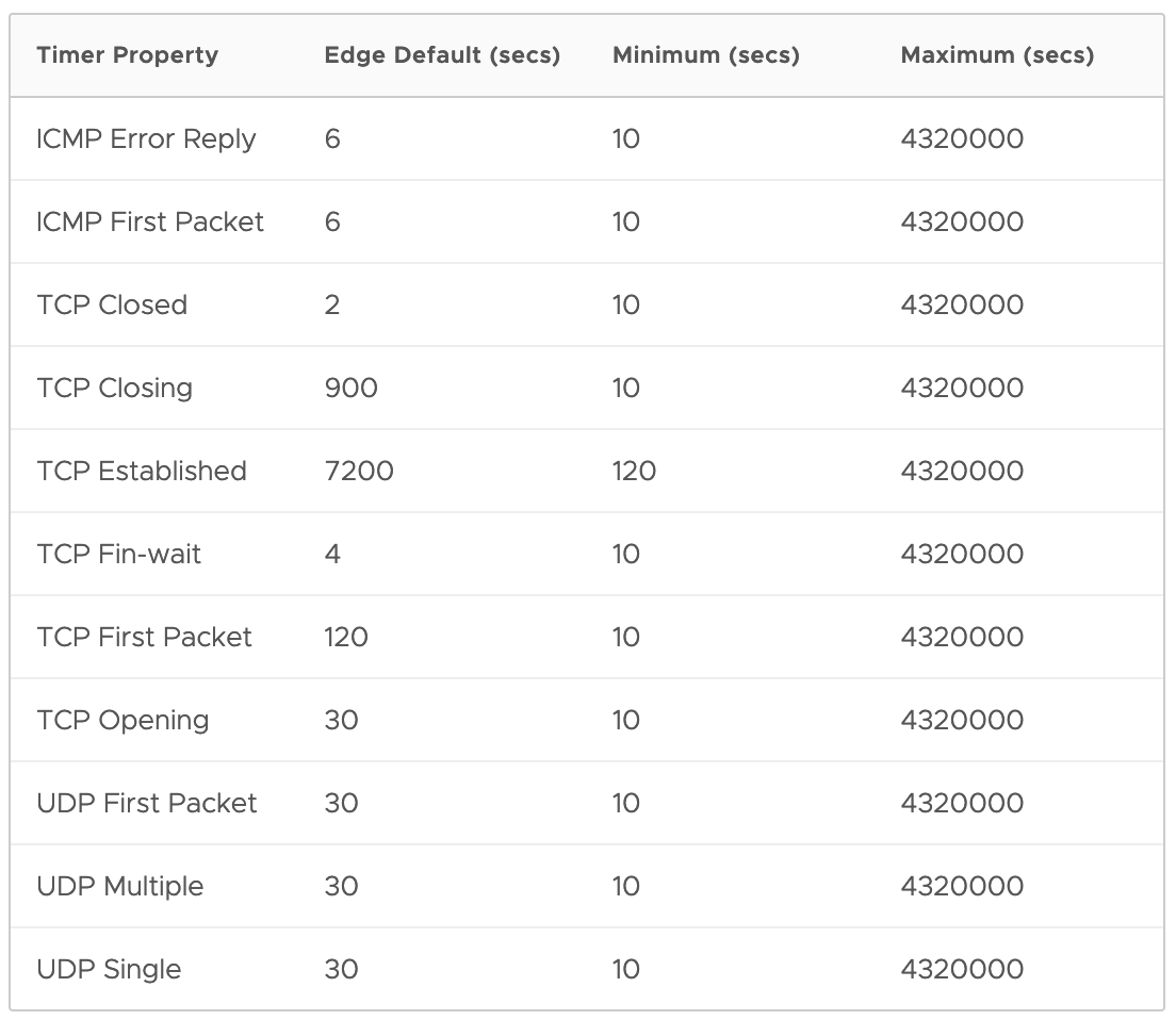 Les timers de session dĂ©finissent la durĂ©e pendant laquelle la session est conservĂ©e aprĂšs une pĂ©riode d'inactivitĂ©. Ă l'expiration de ce dĂ©lai, la session est fermĂ©e. Par dĂ©faut, le distributed firewall et les gateways firewalls ont des timers de session de firewall indĂ©pendantes et sĂ©parĂ©es. Ceci est configurable par passerelle Tier-0/Tier-1 ou par groupe de VM pour DFW Ă l'aide de Groupes. En d'autres termes, les valeurs de session par dĂ©faut peuvent ĂȘtre dĂ©finies en fonction des besoins. Si une valeur trop faible peut entraĂźner des dĂ©passements de dĂ©lai frĂ©quents, une valeur trop Ă©levĂ©e consommera inutilement des ressources.